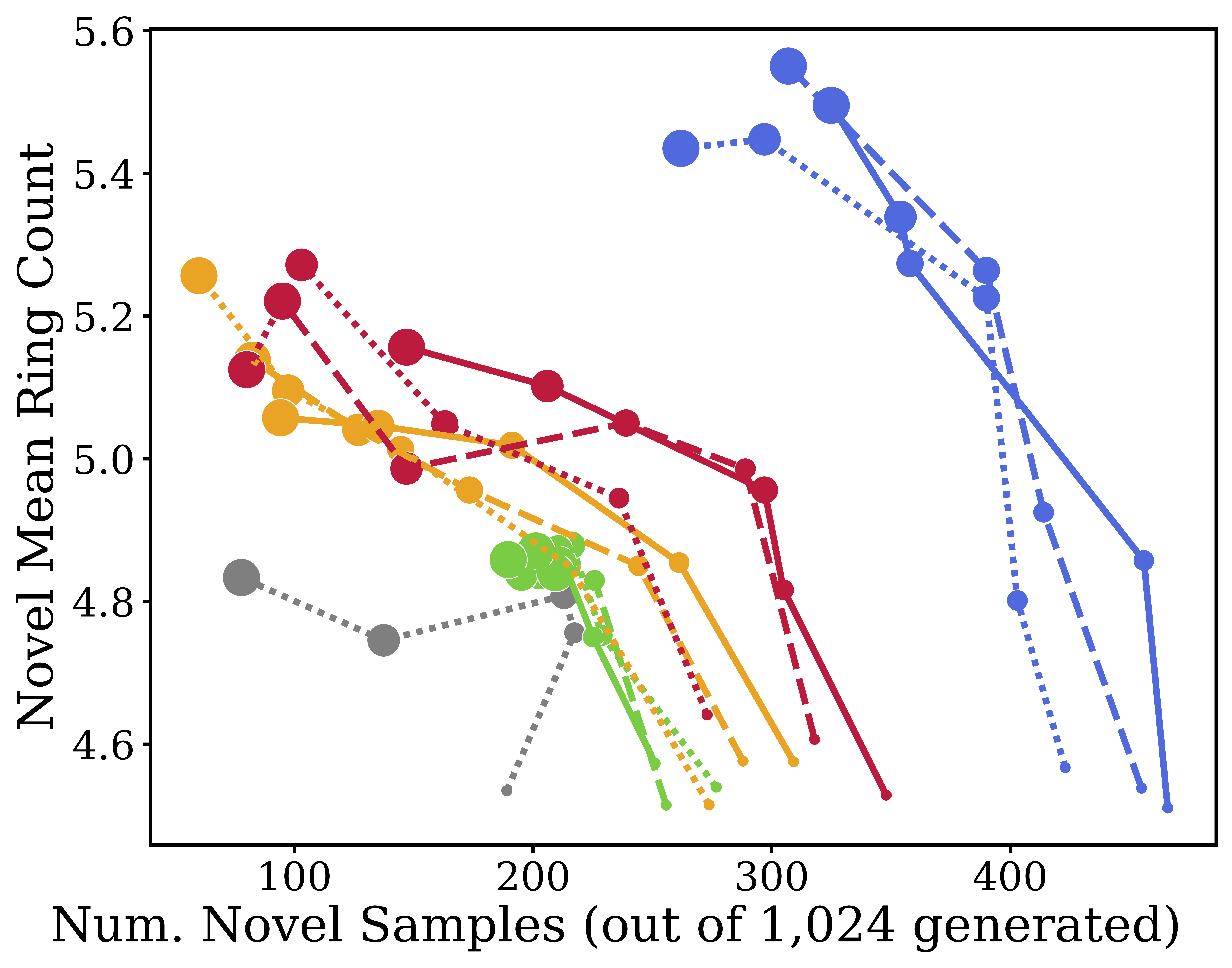 Task & Dataset: We test guided generation using the QM9 dataset, consisting of SMILES string representations of molecules. The goal is to maximize specific chemical properties, namely, ring count and drug-likeness (QED), without causing the generated samples to collapse into invalid or highly repetitive sequences.